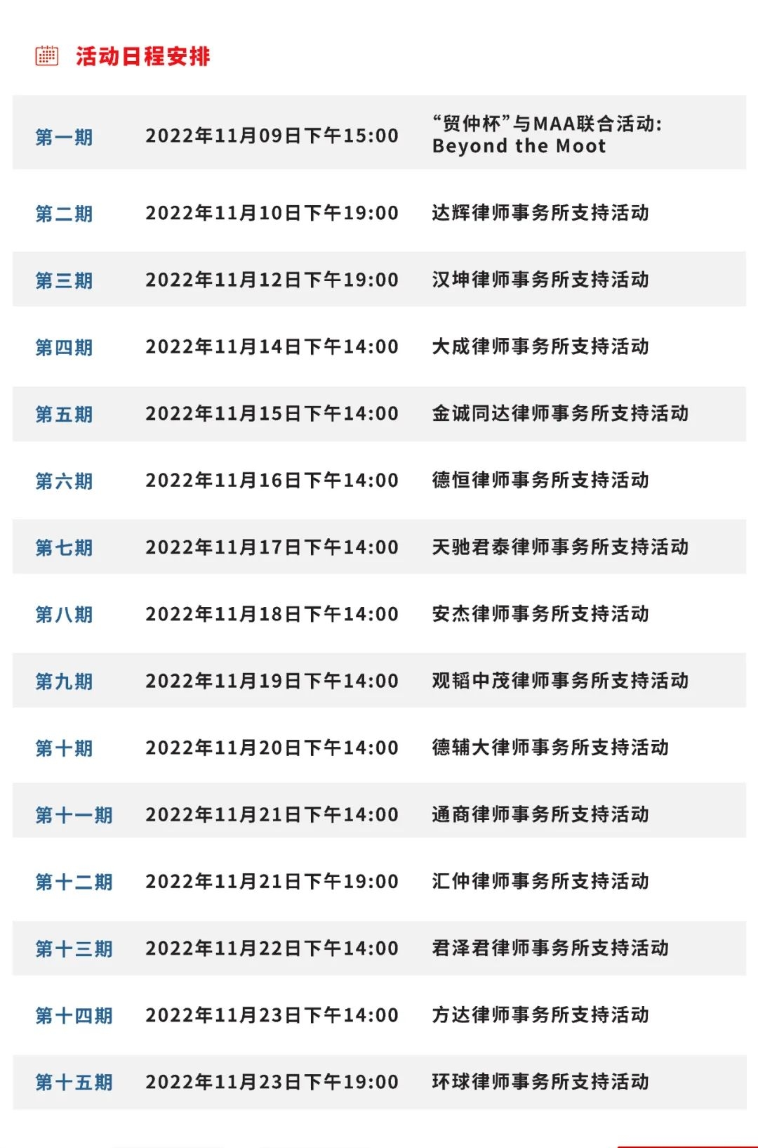 第二十屆“貿(mào)仲杯”國際商事仲裁模擬仲裁庭辯論賽Voice of Moot 系列培訓活動將于2022年11月9日開始,至11月23日結(jié)束,共計15期相關(guān)活動?!百Q(mào)仲杯”辯論賽自2000年舉辦至今已歷經(jīng)十九屆,辯論賽始終秉持培養(yǎng)具備國際化實務能力的涉外仲裁法治人才的初心,匯集了大批國際仲裁法律人才。