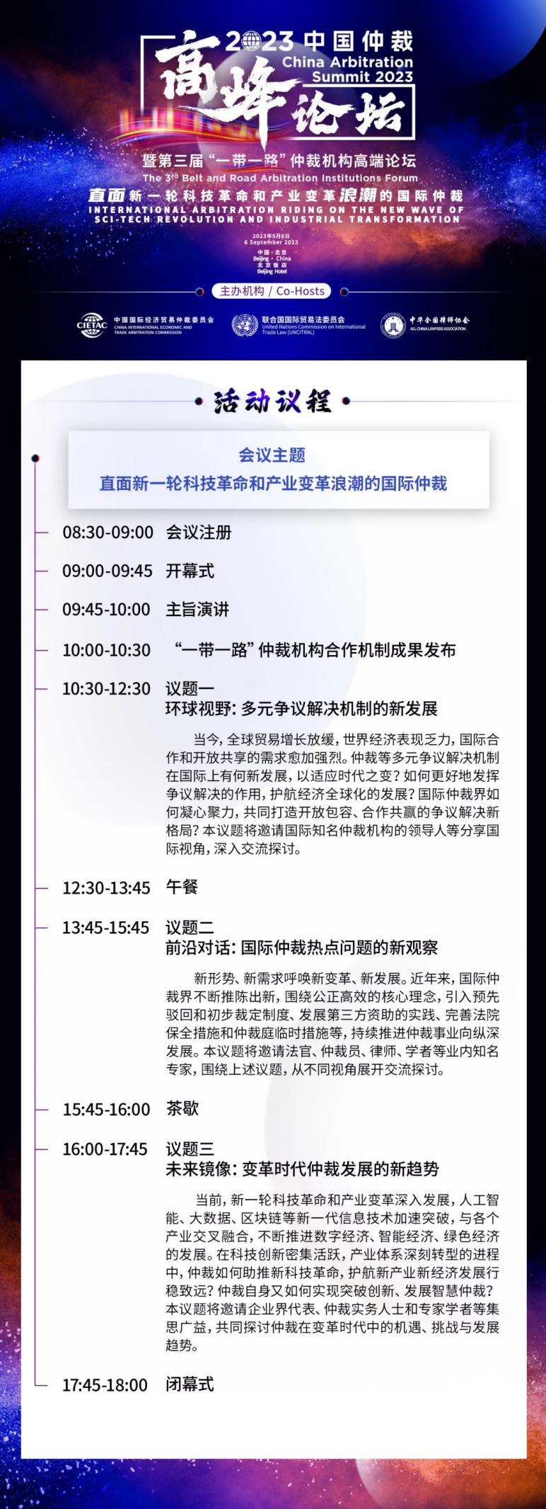 2023中國(guó)仲裁高峰論壇暨第三屆“一帶一路”仲裁機(jī)構(gòu)高端論壇將于2023年9月6日在北京召開。作為中國(guó)仲裁周期間最高規(guī)格的盛會(huì),本屆論壇由中國(guó)國(guó)際經(jīng)濟(jì)貿(mào)易仲裁委員會(huì)、聯(lián)合國(guó)國(guó)際貿(mào)易法委員會(huì)以及中華全國(guó)律師協(xié)會(huì)等機(jī)構(gòu)聯(lián)合主辦,并獲得多家仲裁機(jī)構(gòu)和國(guó)際組織的鼎力支持。
