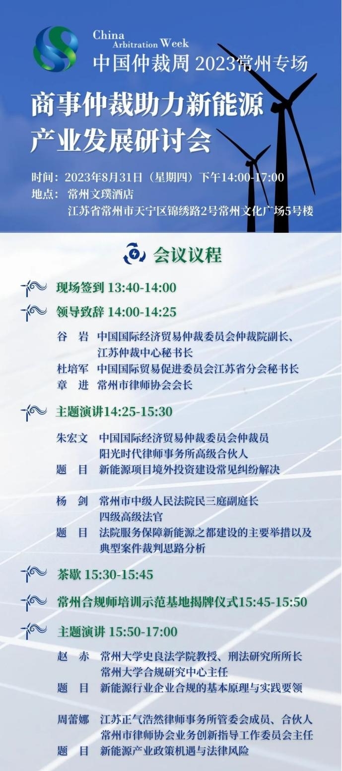 近年來,江蘇省常州市緊扣“國際化智造名城、長三角中軸樞紐”的城市定位,在新能源產(chǎn)業(yè)不斷發(fā)力,著力打造引領長三角,影響全國乃至全球的“新能源之都”。經(jīng)濟的蓬勃發(fā)展,產(chǎn)業(yè)的日益興旺,離不開良好的營商環(huán)境和制度化、規(guī)范化的法律保護措施。本次“中國仲裁周”常州專場活動——商事仲裁助力新能源產(chǎn)業(yè)發(fā)展研討會,將聚焦新能源產(chǎn)業(yè)熱點問題,幫助企業(yè)進一步提升化解國內(nèi)外商事爭議的能力,推動建設公平、高效、法治的市場環(huán)境。