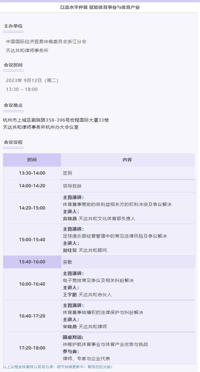 今年6月24日,新修訂的《中華人民共和國體育法》頒布一周年。一年來,我國體育仲裁與體育商事仲裁事業(yè)雙雙迎來快速發(fā)展。值此杭州亞運會盛大召開之際,現(xiàn)擬在第十一屆中國仲裁周期間舉辦專場論壇,深度探討如何以高水平仲裁,賦能體育事業(yè)與體育產業(yè),探索體育糾紛及體育相關商事糾紛解決路徑,為我國的體育事業(yè)和產業(yè)發(fā)展提供法律視角、貢獻專業(yè)智慧。