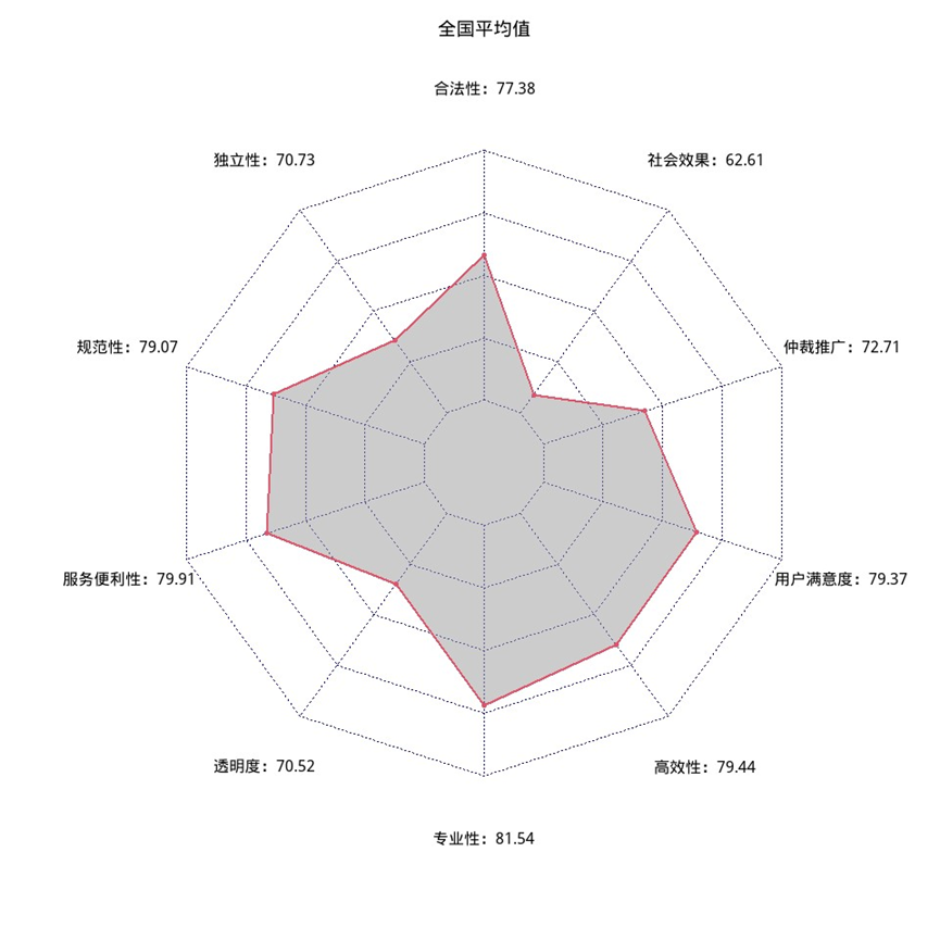 二級(jí)指標(biāo)反映的是仲裁價(jià)值的實(shí)現(xiàn)程度。從二級(jí)指標(biāo)得分情況來(lái)看,得分較高的是服務(wù)便利性、高效性和本地用戶滿意度。得分較低的是社會(huì)效果和透明度。社會(huì)效果指標(biāo)由兩個(gè)比例構(gòu)成,一是受案標(biāo)的額與仲裁機(jī)構(gòu)所在地國(guó)內(nèi)生產(chǎn)總值的比例,二是仲裁機(jī)構(gòu)受理案件數(shù)量與當(dāng)?shù)刂屑?jí)人民法院受理民商事案件的比例。仲裁機(jī)構(gòu)所在地中級(jí)人民法院的受案數(shù)量不完整的,以全國(guó)仲裁案件占全國(guó)民商事訴訟案件的比例為缺失值計(jì)算。仲裁受理民商事案件占訴訟案件比例較低,表明仲裁在促進(jìn)市場(chǎng)經(jīng)濟(jì)建設(shè)、優(yōu)化營(yíng)商環(huán)境以及完善社會(huì)治理體系方面還具有較大的潛力。