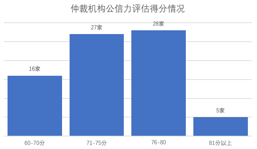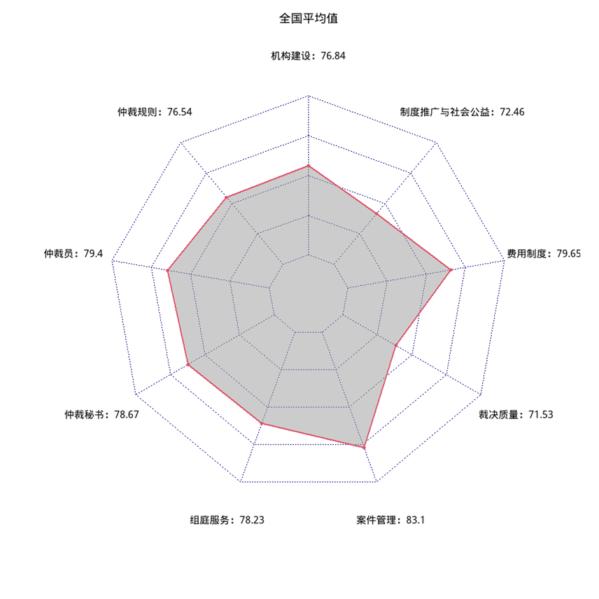 從一級(jí)指標(biāo)得分情況來(lái)看,受調(diào)研仲裁機(jī)構(gòu)表現(xiàn)較好的指標(biāo)是案件管理。該指標(biāo)主要依據(jù)是仲裁用戶的主觀滿意度評(píng)價(jià)。這表明機(jī)構(gòu)所在地的當(dāng)事人對(duì)本地機(jī)構(gòu)的評(píng)價(jià)較高。我國(guó)仲裁發(fā)展不平衡,仲裁資源本地化程度較高,滿意度指標(biāo)橫向可比性較低。該指標(biāo)主要反映機(jī)構(gòu)所在地當(dāng)事人對(duì)該仲裁機(jī)構(gòu)的看法。一級(jí)指標(biāo)中得分最低的是仲裁裁決,僅為71.5分。仲裁裁決指標(biāo)的評(píng)估標(biāo)準(zhǔn)主要是當(dāng)事人向法院申請(qǐng)撤銷(xiāo)仲裁裁決與仲裁機(jī)構(gòu)受案數(shù)量比、法院實(shí)際撤裁與當(dāng)事人申請(qǐng)撤裁案件數(shù)量比以及法院實(shí)際撤裁案件與仲裁機(jī)構(gòu)受理案件數(shù)量比。該項(xiàng)指標(biāo)評(píng)估依據(jù)來(lái)源權(quán)威,效度較高,可以部分反映仲裁公信力建設(shè)的實(shí)際情況。