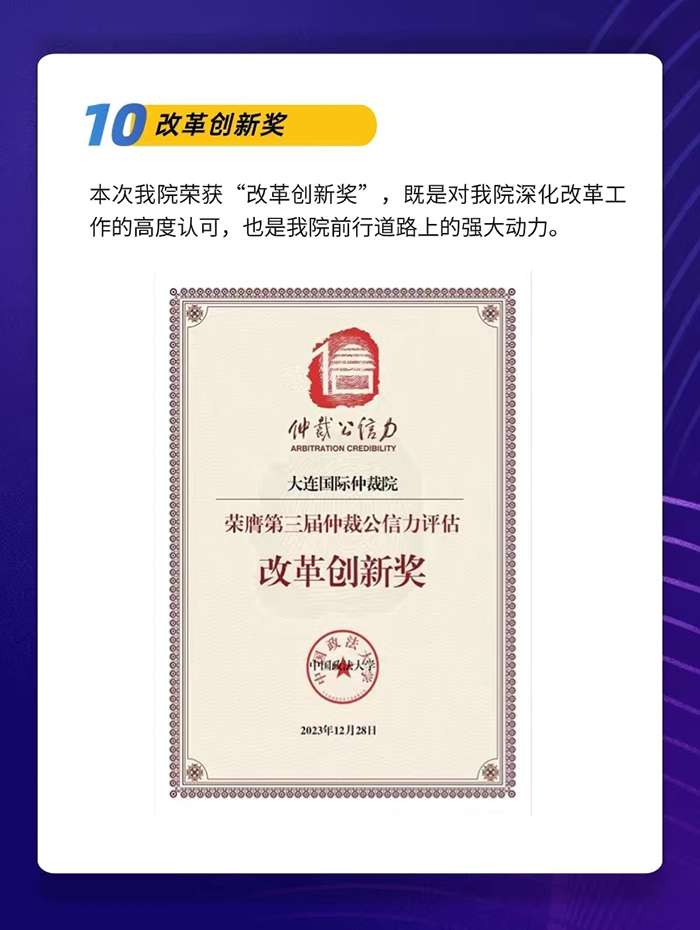 歷史的畫卷,在砥礪前行中鋪展;時代的華章,在接續(xù)奮斗中書寫。展望2024,大連國際仲裁院將在遼寧省大連市委、市政府的堅強領(lǐng)導(dǎo)下,始終秉持鑄造公信力的價值理念,以滾石上山、負(fù)重前行的決心抓發(fā)展,以“高質(zhì)量、高效率、高服務(wù)水平”的三高標(biāo)準(zhǔn)為抓手,創(chuàng)新工作機制,著眼隊伍建設(shè),拓寬服務(wù)領(lǐng)域,搭建服務(wù)平臺,努力營造優(yōu)質(zhì)的仲裁法治環(huán)境,最大程度化解社會矛盾,實現(xiàn)大連仲裁事業(yè)的新跨越、新發(fā)展、新輝煌。