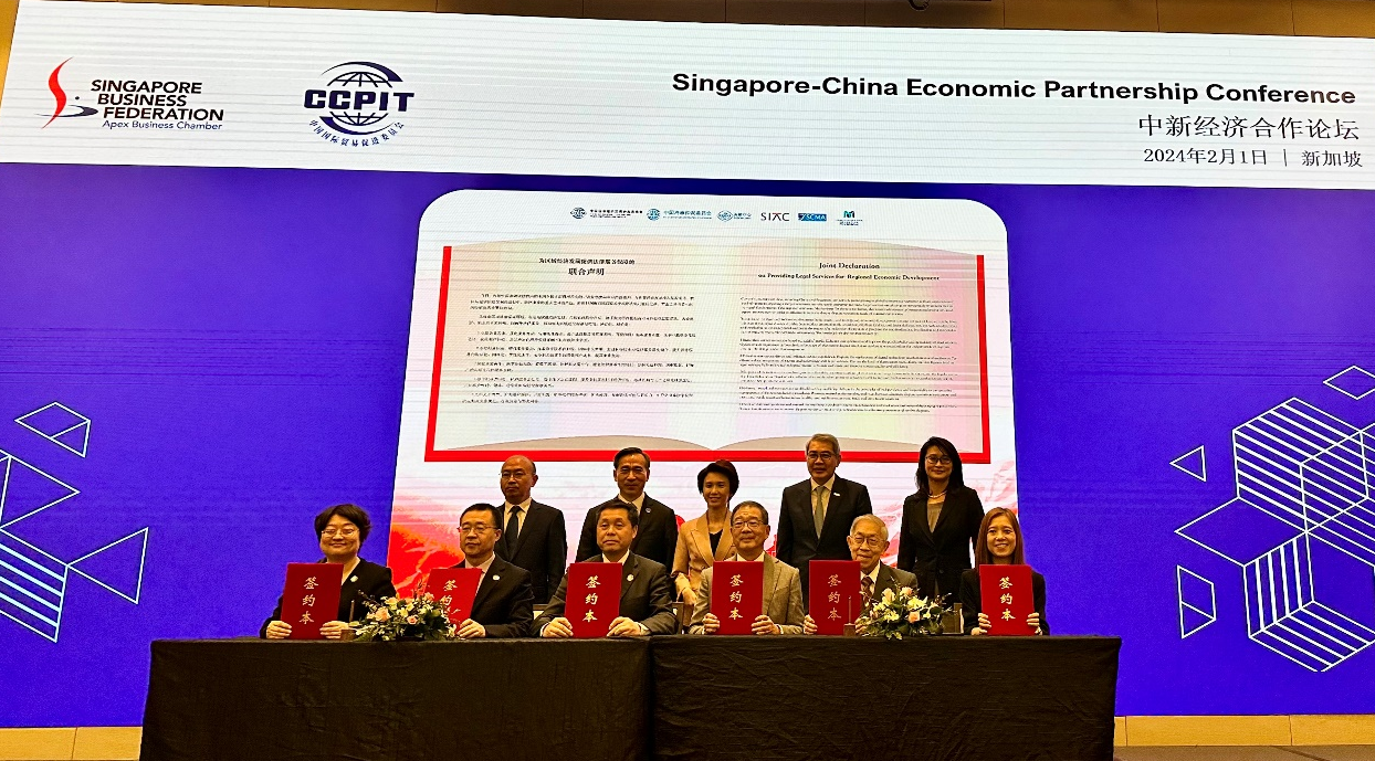 2月1日,在中國貿(mào)促會會長任鴻斌率中國企業(yè)家代表團訪問新加坡期間,中國國際經(jīng)濟貿(mào)易仲裁委員會副主任兼秘書長王承杰、中國海事仲裁委員會副主任李虎、中國貿(mào)促會調(diào)解中心執(zhí)行副主席蔡晨風與新加坡國際仲裁中心首席執(zhí)行官林美恩、新加坡海事仲裁院主席趙錫燊、新加坡國際調(diào)解中心主席林長仁在新加坡共同發(fā)布《為區(qū)域經(jīng)濟發(fā)展提供法律服務(wù)保障的聯(lián)合聲明》。中國貿(mào)促會會長任鴻斌,新加坡貿(mào)易與工業(yè)部兼文化、社區(qū)及青年部政務(wù)部長劉燕玲,中國駐新加坡大使館公使銜參贊宗長青,新加坡工商聯(lián)合總會主席林明彥,新加坡律政部副常任秘書張伊靜出席并見證聲明發(fā)布。