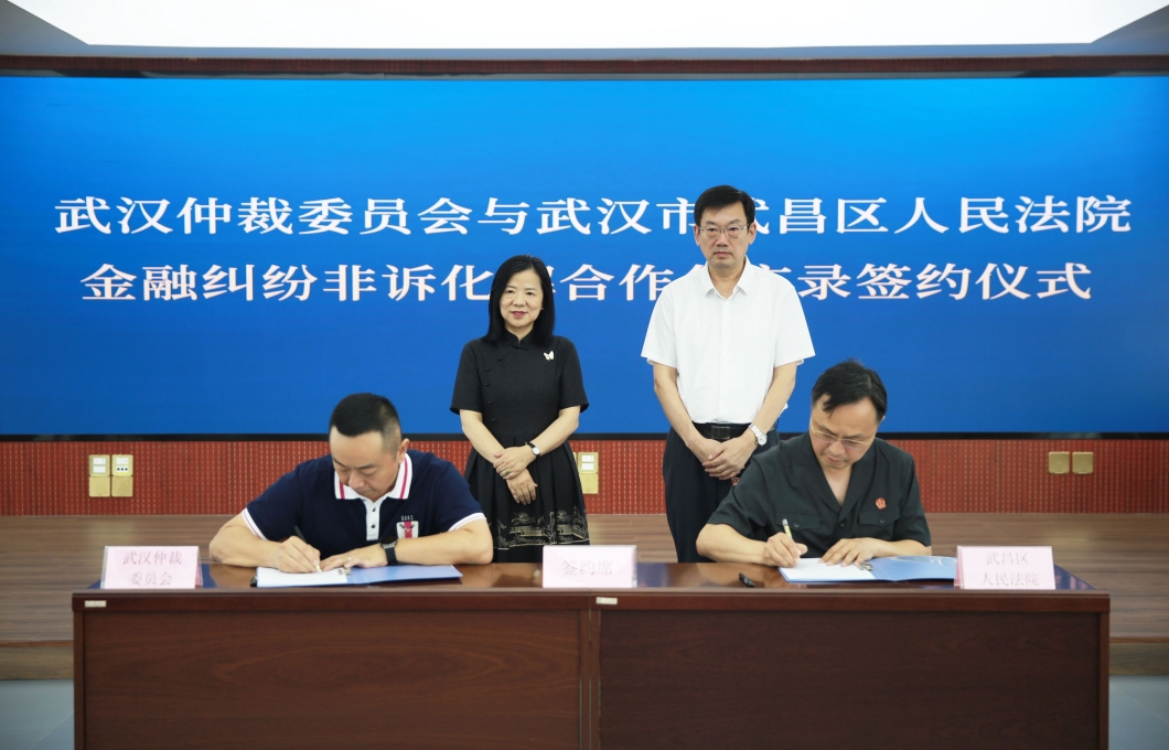 (圖為武漢仲裁委員會與武昌區(qū)人民法院簽署共建金融糾紛非訴化解機制合作備忘錄)