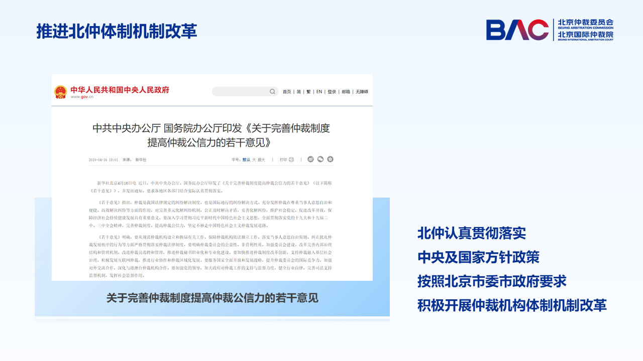 北仲認(rèn)真貫徹落實中央及國家方針政策,按照北京市委市政府要求積極開展了仲裁機(jī)構(gòu)體制機(jī)制改革。