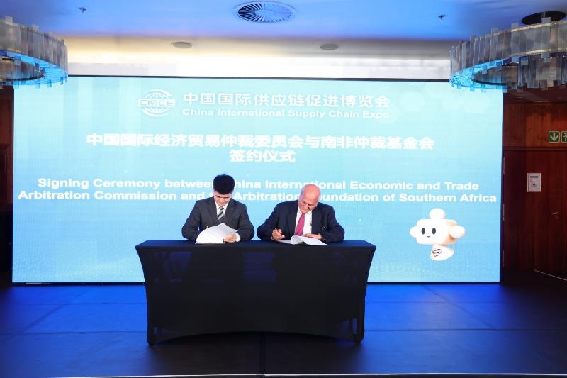 2月20日,在中國(guó)-南非經(jīng)貿(mào)論壇暨第三屆鏈博會(huì)推介會(huì)上,中國(guó)國(guó)際經(jīng)濟(jì)貿(mào)易仲裁委員會(huì)(簡(jiǎn)稱貿(mào)仲)與南非仲裁基金會(huì)簽署合作協(xié)議,并在中國(guó)貿(mào)促會(huì)會(huì)長(zhǎng)任鴻斌、中國(guó)駐南非使館公使李志剛、南非豪登省副省長(zhǎng)雅各布·馬馬波羅以及現(xiàn)場(chǎng)來自中非多國(guó)和地區(qū)的政府機(jī)構(gòu)、工商界法律界代表200余人的共同見證下,舉辦了簽約儀式。