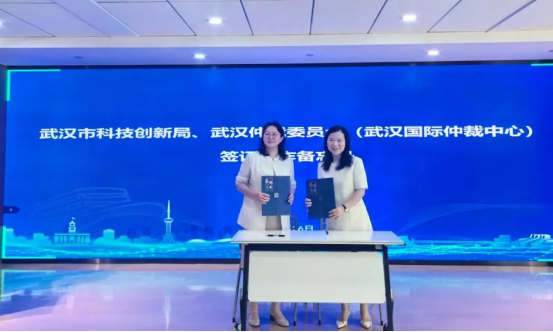 武漢市科技創(chuàng)新局黨組書(shū)記、局長(zhǎng)董丹紅和武漢仲裁委辦黨組書(shū)記、主任羅平分別代表雙方單位簽署合作備忘錄。