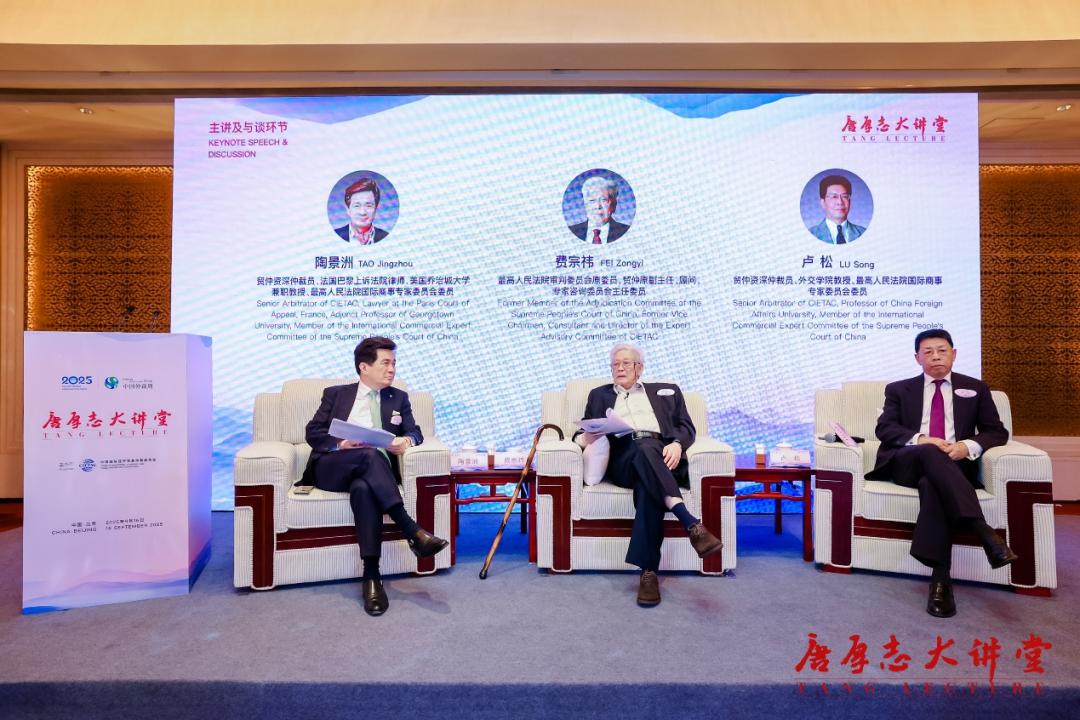9月16日,由中國國際經(jīng)濟貿易仲裁委員會(簡稱“貿仲”)主辦的第九屆“唐厚志大講堂”作為中國仲裁周重點活動之一在京舉行。最高人民法院審判委員會原委員,中國國際經(jīng)濟貿易仲裁委員會原副主任、顧問、專家咨詢委員會主任委員費宗祎教授以“中國商事仲裁的發(fā)展與展望”為題作主題演講。貿仲資深仲裁員、法國巴黎上訴法院律師、美國喬治城大學兼職教授、最高人民法院國際商事專家委員會委員陶景洲先生,貿仲資深仲裁員、外交學院教授、最高人民法院國際商事專家委員會委員盧松先生進行與談。貿仲副主任兼秘書長王承杰主持本場活動并致辭。來自全球30個國家和地區(qū)的仲裁機構負責人、仲裁員、律師、學者及工商界人士等近300名海內外嘉賓現(xiàn)場參與,超過3000人次線上收看直播。