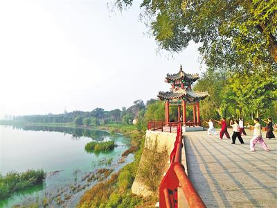 清晨,在故城縣大運(yùn)河國(guó)家文化公園,人們迎著朝陽鍛煉身體。河北日?qǐng)?bào)記者 焦 磊攝