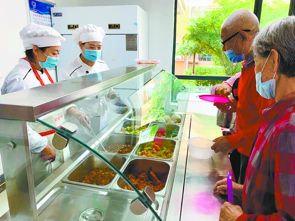 老人們在古城臺街道王府花園助餐服務點取餐。古城臺街道辦事處供圖