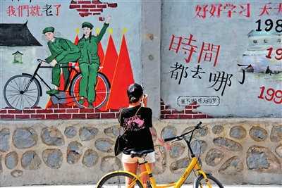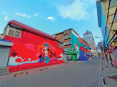 除了火紅的色彩外,巷子兩側(cè)老居民樓的外墻上,還繪了藍(lán)色的熊貓、橘紅的鹿、黃色的長(zhǎng)頸鹿和航天科幻作品,以及上世紀(jì)七八十年代的理發(fā)店、小賣部。整條巷子看上去色彩斑斕。常住于此的市民韓巍東說,多年來,這條巷子給他的感覺是破舊、灰色的,但去年的這些改變,讓他日日走過的老巷,變得充滿活力和生機(jī),住在這里的人們,臉上也多了幾分笑意。