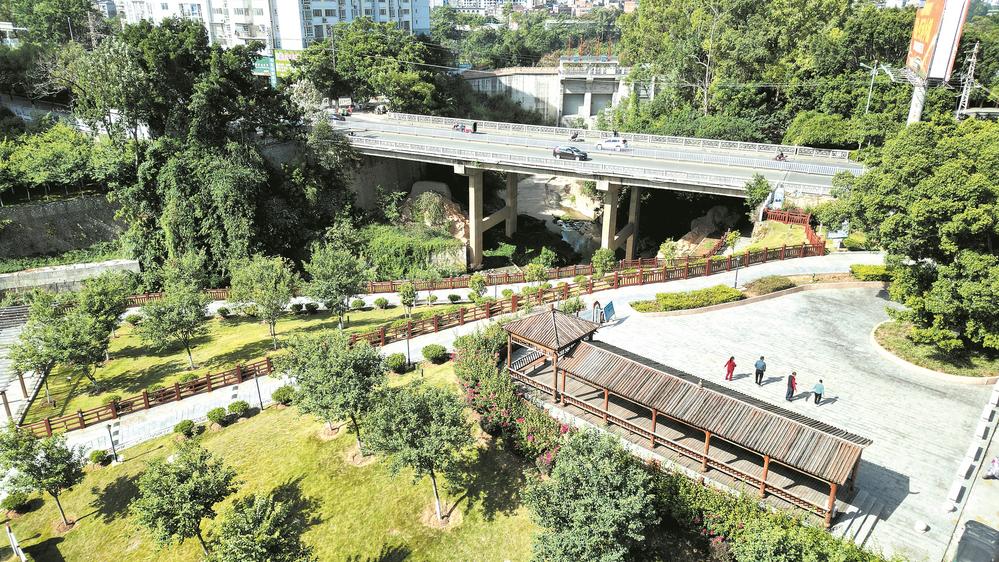 步道干凈整潔、河溝清水流淌、鳥鳴聲清脆悅耳……每天一大早,居住在城區(qū)維林市場的居民羅壽豐都會(huì)帶孫子到草鞋溝生態(tài)公園散步。這里樹木成蔭,綠草遍地,大小不一的鵝卵石錯(cuò)落鋪設(shè)在步道一側(cè),醒目的紅漆圍欄點(diǎn)綴著河溝兩岸的綠茵植被,一片秋意盎然。