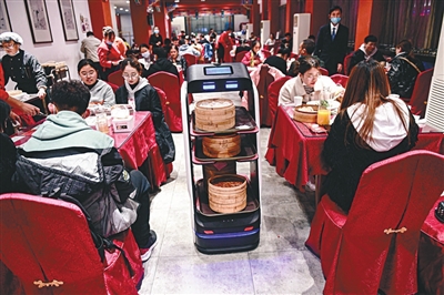 “現(xiàn)在做餐飲招人太難了,使用機(jī)器人送餐可以幫我們降低人工成本。”餐廳負(fù)責(zé)人告訴記者,目前店里六七成的傳菜工作都會交給機(jī)器人操作。一臺機(jī)器人每天送餐效率能頂2名普通傳菜員。而且,機(jī)器人每次可以送一桌菜,減少了顧客等餐時間,同時也提高了翻臺率。