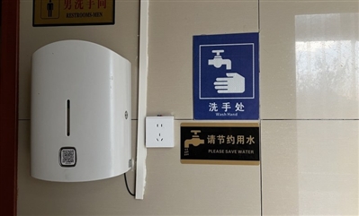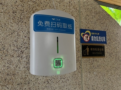 市民章小姐拿出手機(jī)掃描取紙機(jī)上的二維碼,數(shù)秒鐘機(jī)器便“吐”出長長的衛(wèi)生紙。洗手時將手放在洗手液盒下方,無需接觸,感應(yīng)出液。
