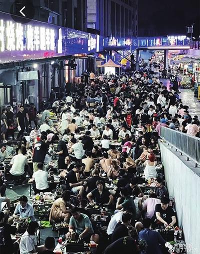 在熱門打卡地,大約晚上7時,燒烤店門口排了幾百米的長龍,有人帶著馬扎,還有人帶著零食,交警在街頭路口維持秩序。來自江蘇的游客說:“當?shù)嘏笥严挛?時多就來幫忙排隊了,現(xiàn)在終于吃上了?!辈灰粫?,燒烤店負責人拿起了小喇叭:“手里沒菜單的別排隊了,店里沒肉了?!?/p>