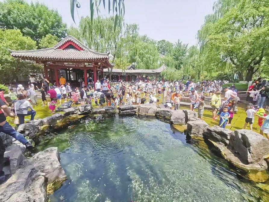 游人在泉畔親水區(qū)戲水享受清涼。記者 呂傳泉 攝