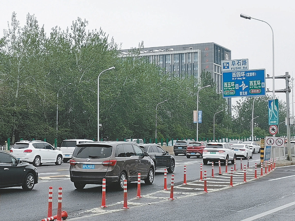 5月27日14時,記者來到楊莊東橋東側(cè)阜石路入口。此時雖是周末的平峰時期,但入口處兩條車道上一直滿滿地排著車輛。在20分鐘的觀察時間里,記者發(fā)現(xiàn),大約有一多半的司機遵守了規(guī)定。有左側(cè)車道內(nèi)的司機在前車駛?cè)牒?,發(fā)現(xiàn)右側(cè)車道上的車輛還在后方,會主動踩下剎車,等候右側(cè)車輛先行駛?cè)?;也有身在右?cè)車道的司機,在左側(cè)車道車輛駛過,發(fā)現(xiàn)其后的車輛還要跟著駛?cè)耄谑谴蜷_車窗作出“按壓”的停止手勢,要求旁邊車輛等待,以便交替通行。