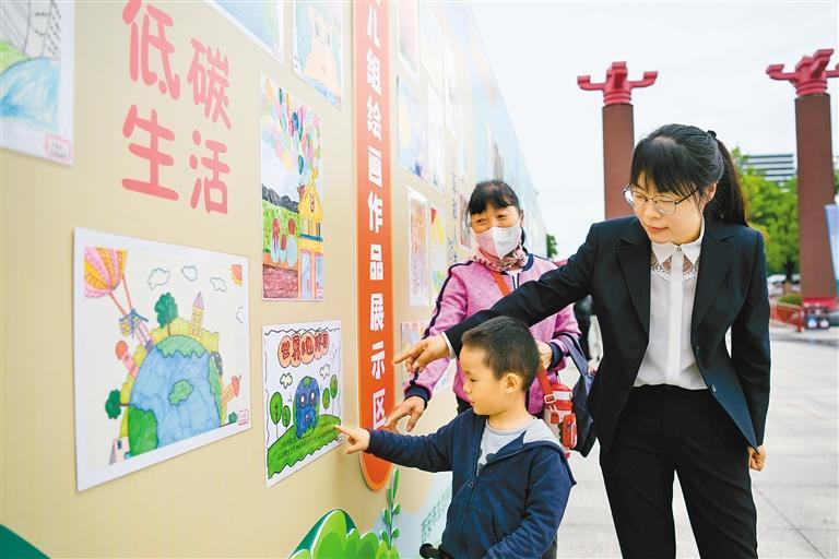 上午9時許,記者看到,設(shè)立在活動現(xiàn)場的生態(tài)文明建設(shè)成效主題展板吸引市民紛紛駐足圍觀。另一側(cè)的巨大圖畫墻上,集中展示著由100名小朋友親手繪制的環(huán)保作品,用兒童的視角傳遞著環(huán)保理念。
