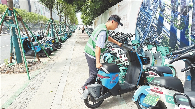 7月20日,南昌市紅谷灘區(qū)萬(wàn)象路上,早高峰剛過(guò)不久,一名穿著綠色馬甲的共享電單車(chē)運(yùn)維人員便忙活開(kāi)了。與以往不同的是,在他整理的車(chē)輛中,不僅有綠色的“自家”車(chē)輛,還有藍(lán)色、黃色的“別家”車(chē)輛。一個(gè)小時(shí)后,100多輛品牌各異的共享電單車(chē)便整整齊齊地停放好了。