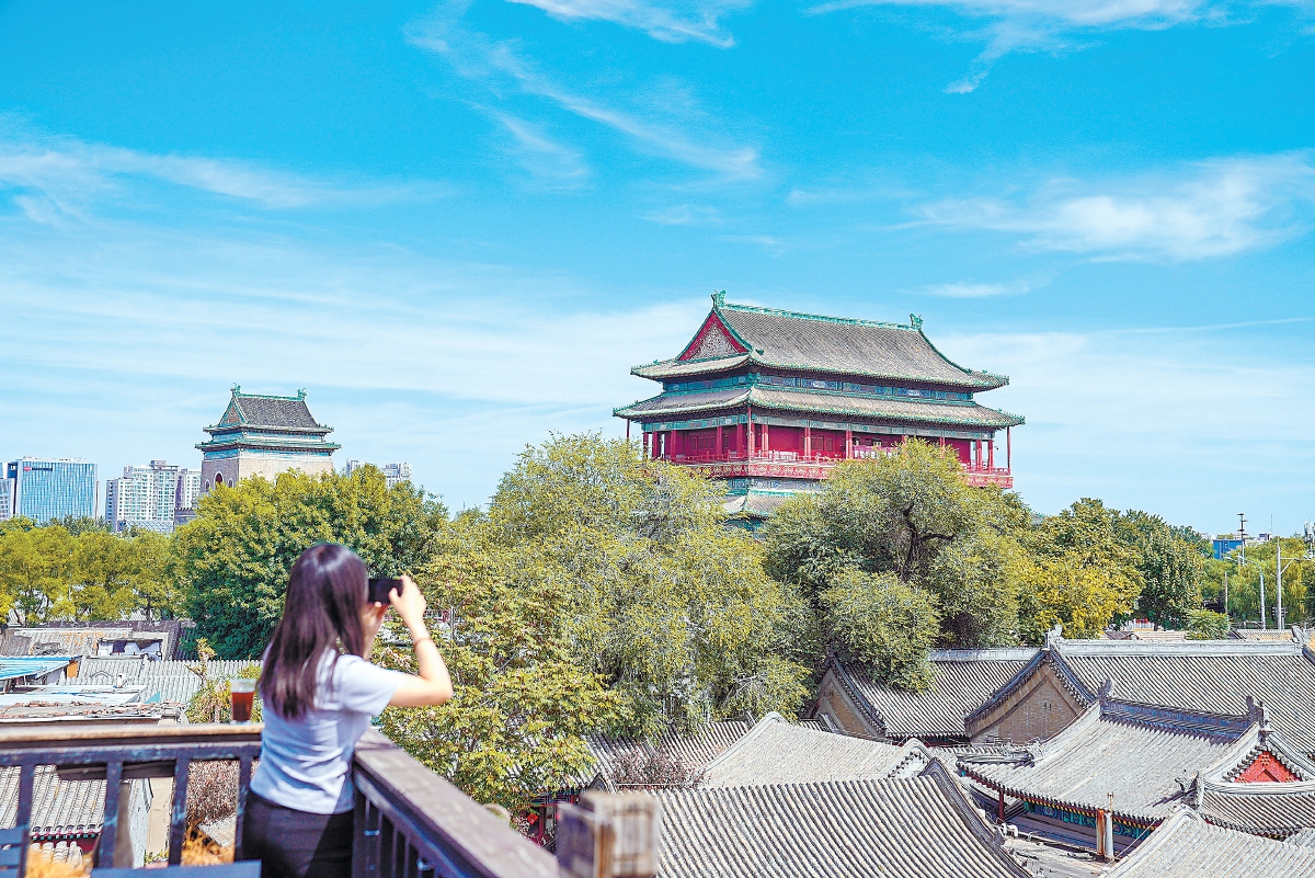 初秋,站在鼓樓底下抬頭看,云卷云舒,紅墻灰瓦,重檐屋頂?shù)木G琉璃剪邊在藍天下閃閃發(fā)亮。鼓樓內(nèi),一場數(shù)字沉浸展,讓600多歲的古建獲“新生”;隆隆鼓聲,穿過紅墻,伴著悠悠鴿哨;鼓樓外,三岔路口,107路公交緩緩駛過,拍照打卡的游人絡繹不絕……