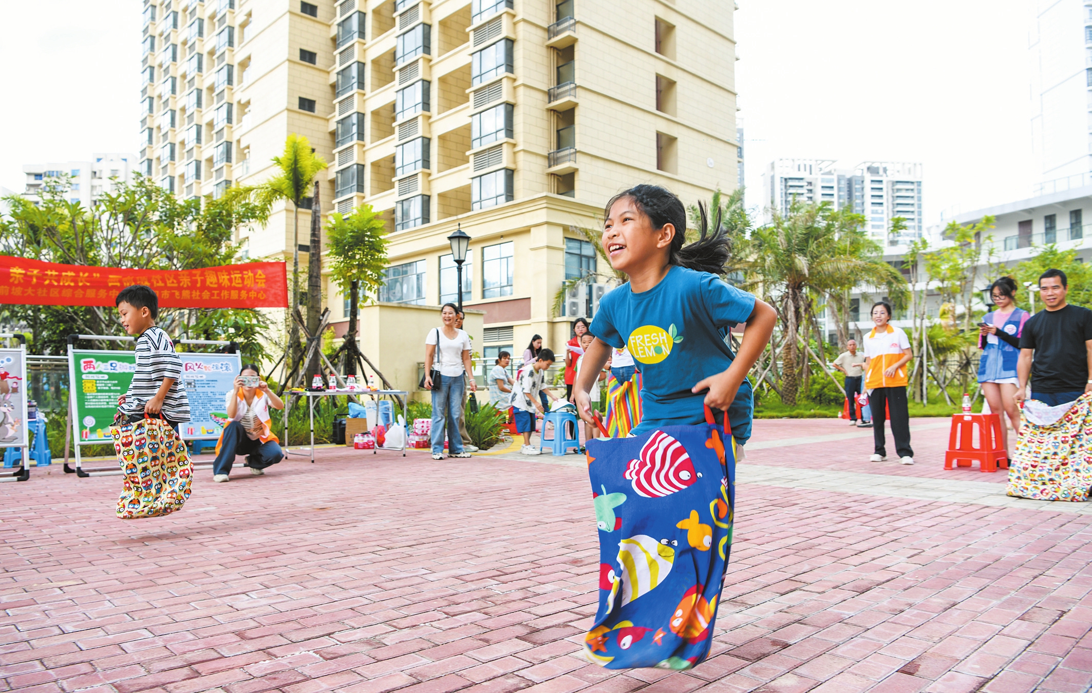 9月16日,在面前坡社區(qū)組織開展的親子趣味運(yùn)動(dòng)會(huì)上,小朋友正在參加“歡樂袋鼠跳”游戲。記者 康登淋 攝