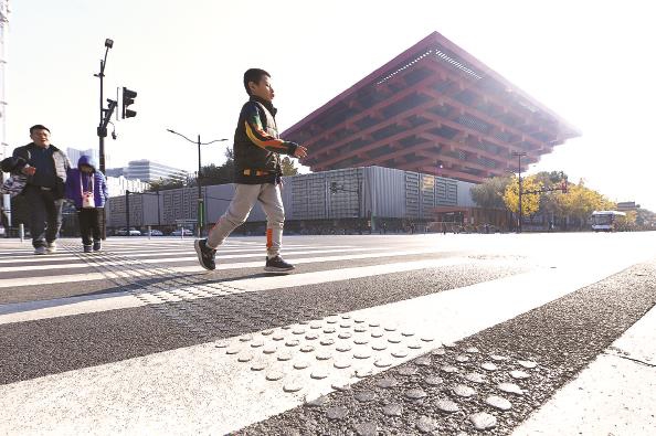 上南路人行橫道線上首次鋪設(shè)了過(guò)街盲道