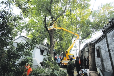 9點(diǎn),斷接導(dǎo)線工作結(jié)束,胡同的高壓線纜“脫網(wǎng)”。緊接著,橘黃色的高架車開進(jìn)胡同,將拿著油鋸的工人送上十幾米的高空,他們要對(duì)高壓線附近的樹冠進(jìn)行修剪。