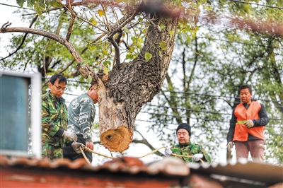不遠(yuǎn)處,幾名綠化工人踩在房頂上,將帶著墜物的麻繩拋到樹上,高架車上的工人捆好繩子,待吊車鉤住捆著樹枝的繩子后,再將其鋸斷,防止掉落砸到行人。