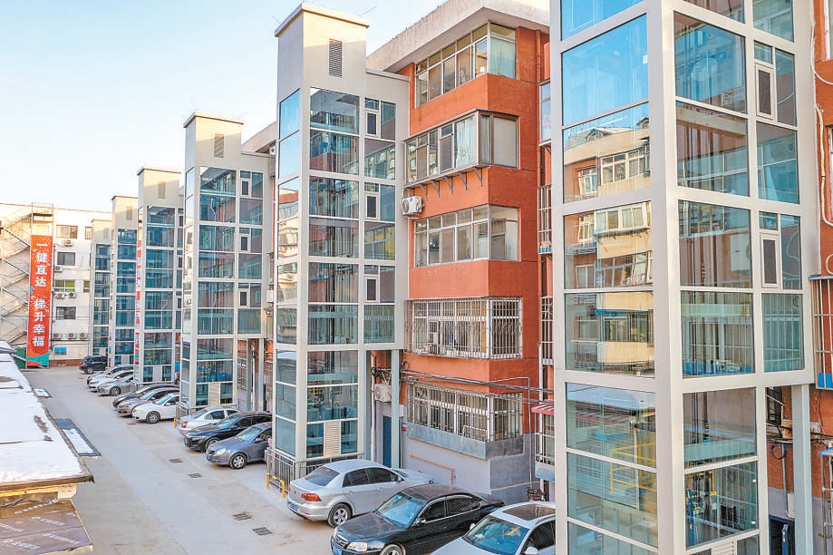 寒冬時節(jié),走進石景山區(qū)金四區(qū)教工樓小區(qū),樓北側(cè)的新電梯整齊劃一?!爸挥酶囊淮危堇锱土?,電梯加上了,地下的排水熱力管道也要通通換新,挺好!”提起改造,已近古稀之年的居民王振相連連稱贊。