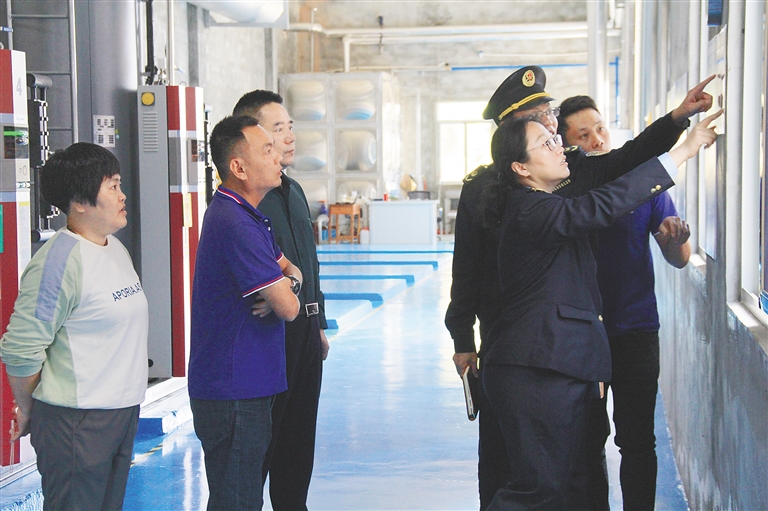 陽光照進鍋爐房內,身穿藍色工服的工人做著日常維護,瓊海市綜合行政執(zhí)法局工作人員在開展檢查。