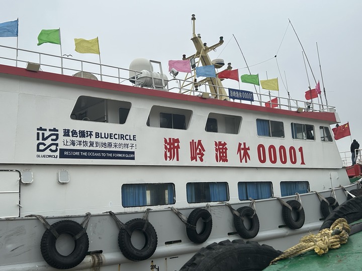 臺(tái)州溫嶺一艘休閑漁船上印著“藍(lán)色循環(huán)”的標(biāo)志。記者 黃筱 攝