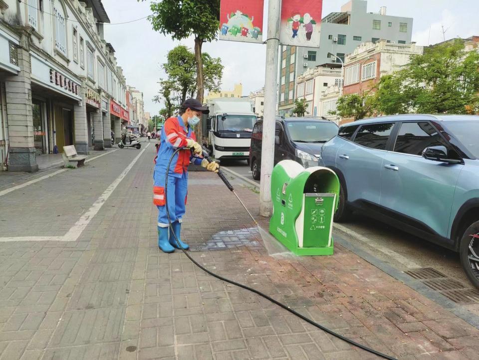 海口京美公司清洗果皮箱。北環(huán)海分公司供圖