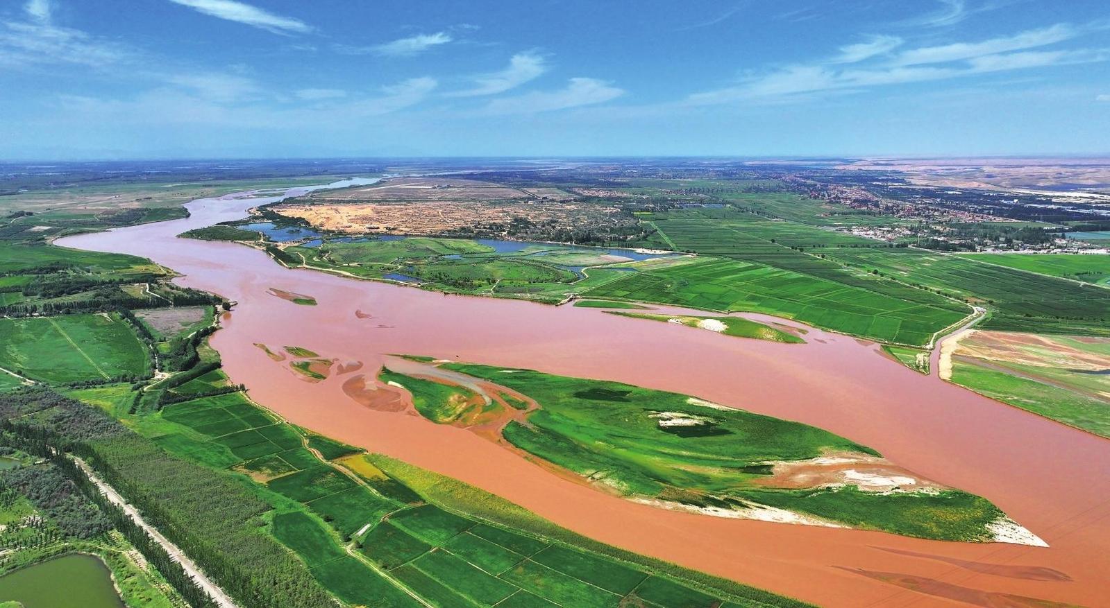 黃河銀川段兩岸綠意盎然(2023年8月13日攝)。