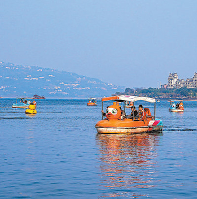 重慶市開(kāi)州區(qū)漢豐湖景區(qū)景美如畫(huà),游客在觀光游玩。王曉宇 攝(人民視覺(jué))