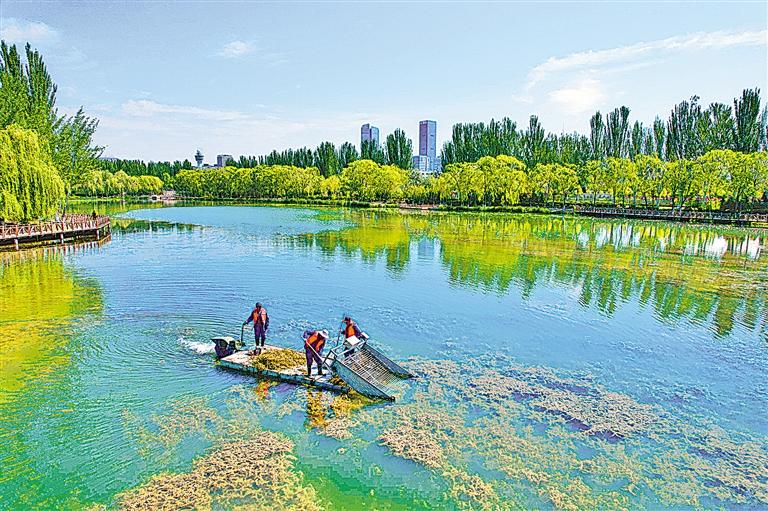 5月8日,銀川市河道管理所的工作人員清撈典農(nóng)河河道內(nèi)的水草。隨著氣溫升高,典農(nóng)河中的水草進入生長繁殖高發(fā)期,大面積生長的水草不僅會影響河道景觀,腐爛的水草還會對水域造成污染、滋生蚊蠅,影響水域生態(tài)環(huán)境。針對不同水域水草生長態(tài)勢,銀川市水務(wù)部門按照“科學(xué)管控、生態(tài)治理”的原則提前安排,分河段、分時間對過量生長的水草實施修剪、打撈清理,讓河水保持清澈,為市民創(chuàng)造良好的宜居環(huán)境。(記者馬楠 王洋 攝)