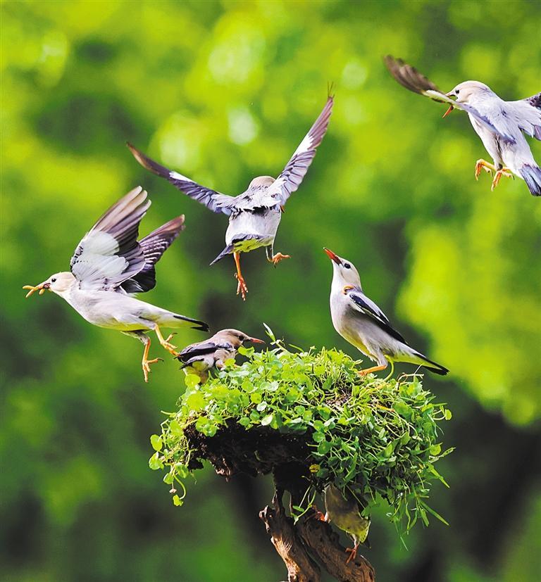 5月19日,上海市寶山區(qū)大華行知公園,絲光椋鳥在覓食嬉戲。成林 攝(中經(jīng)視覺)