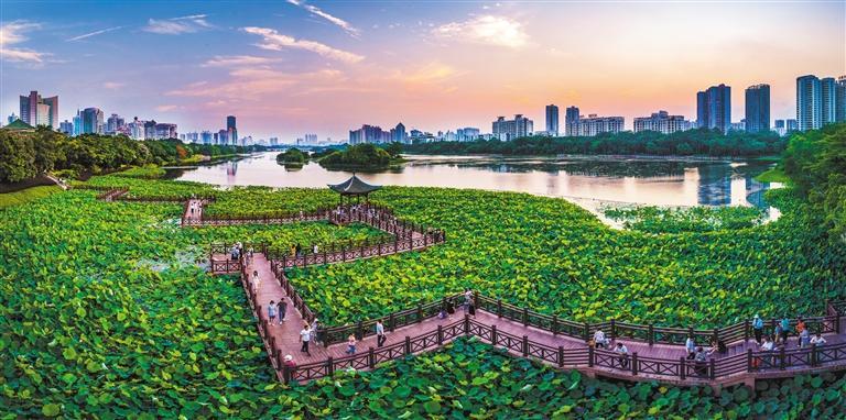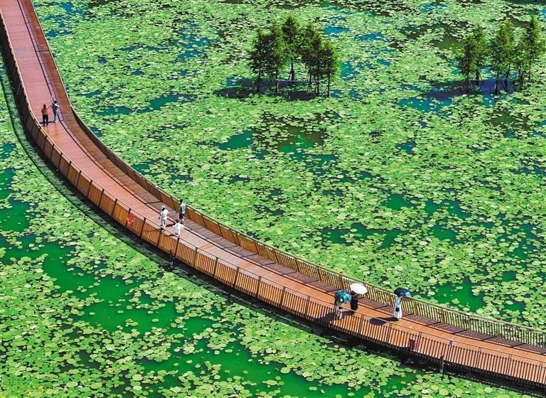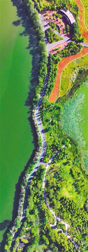 5月29日,俯瞰江西省南昌市華僑城生態(tài)藝術(shù)公園,西堤蜿蜒曲折,綠植郁郁蔥蔥,湖面波光粼粼。陳盛 攝(中經(jīng)視覺)