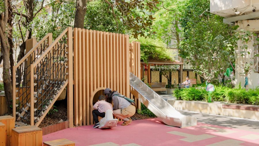 最終,設(shè)計師圍著一棵廣玉蘭和一棵小桂花樹打造了“兒童游戲區(qū)”,設(shè)計了小小的樹屋滑梯,提供爬網(wǎng)與木樁小山的雙重攀爬選擇。木樁小山背后設(shè)計了一個超大的黑板墻?!耙庀氩坏降摹糜谩?。居委干部告訴我們,孩子們在黑板上不只是涂涂畫畫,還能寫作業(yè)、算數(shù)學(xué)題。”