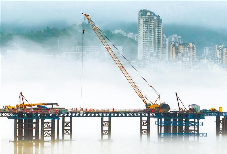 7月12日,重慶市開(kāi)州區(qū)漢豐湖云霧繚繞,工人正在修建濱湖棧道。近年來(lái),開(kāi)州區(qū)持續(xù)優(yōu)化環(huán)湖城區(qū)配套設(shè)施,加快推進(jìn)濱湖棧道、步道等景觀建設(shè),滿(mǎn)足市民休閑需求、改善人居環(huán)境、提升城市品質(zhì)。王曉宇 攝(中經(jīng)視覺(jué))