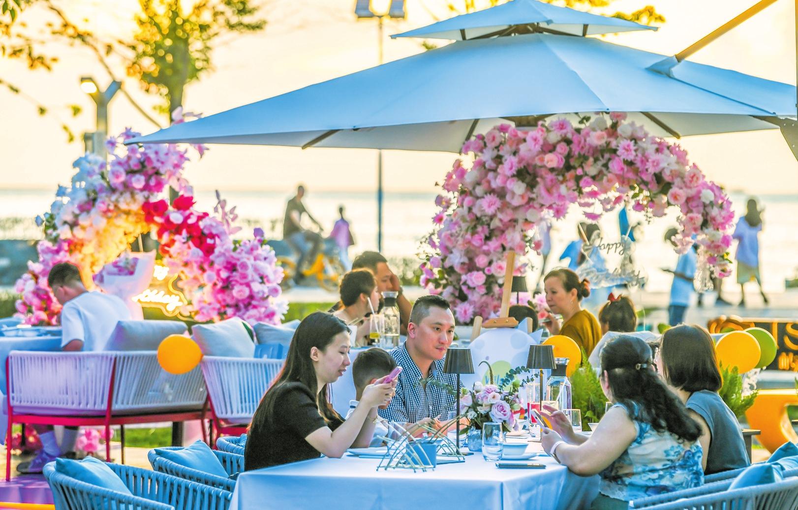 近日,走進位于龍華區(qū)的??贔UNBAY自在灣商業(yè)街區(qū),記者看到已有不少品牌入駐。據(jù)介紹,該街區(qū)計劃于年內(nèi)正式開街,規(guī)劃有包括餐飲、娛樂、復(fù)合零售等在內(nèi)的多個業(yè)態(tài)。在IS PARTY嶼海之約餐廳酒吧,露天區(qū)域被鮮艷的花束裝點得十分浪漫,食客們在其中傾聽音樂、享用美食。“我們看中??跒车膮^(qū)位優(yōu)勢,希望通過提供濱海消費場景,為??谠鎏砘盍Ω泻蜁r尚感?!痹摬蛷d酒吧店長王李平介紹。