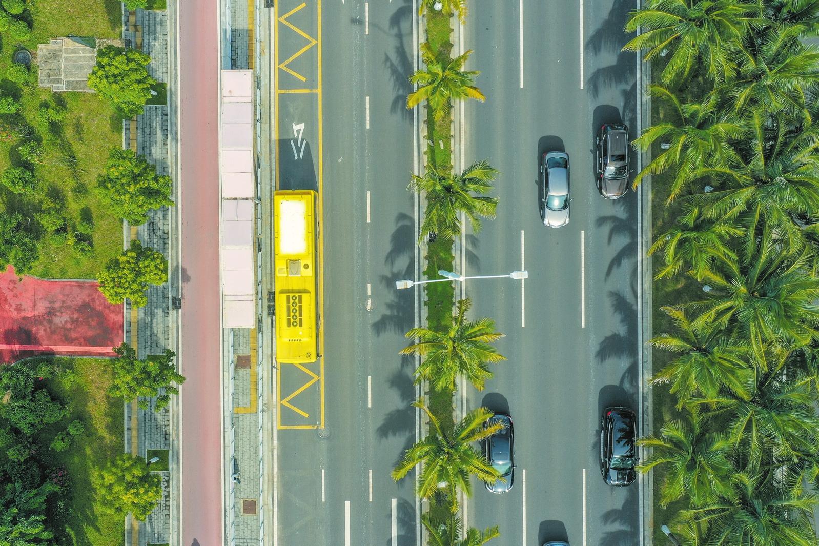 白駒大道沿線,造型獨(dú)特的公交站臺(tái)與路邊一字排開的椰樹相映成趣,彰顯??诘摹拔兜馈薄S浾?孫士杰 攝