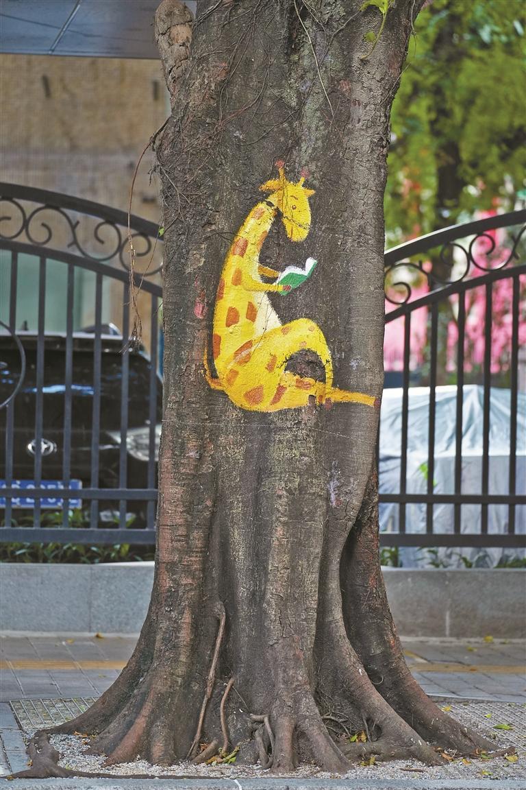 涂鴉正成為社區(qū)文化的新元素。在圓嶺百花二路深圳實(shí)驗(yàn)學(xué)校(小學(xué)部)前的樹(shù)干上,有一只拿著書(shū)卷、戴著“博士帽”的貓咪和靜靜讀書(shū)的“長(zhǎng)頸鹿”,當(dāng)放學(xué)的學(xué)生們?cè)诖寺愤^(guò),畫(huà)面和諧而溫馨。