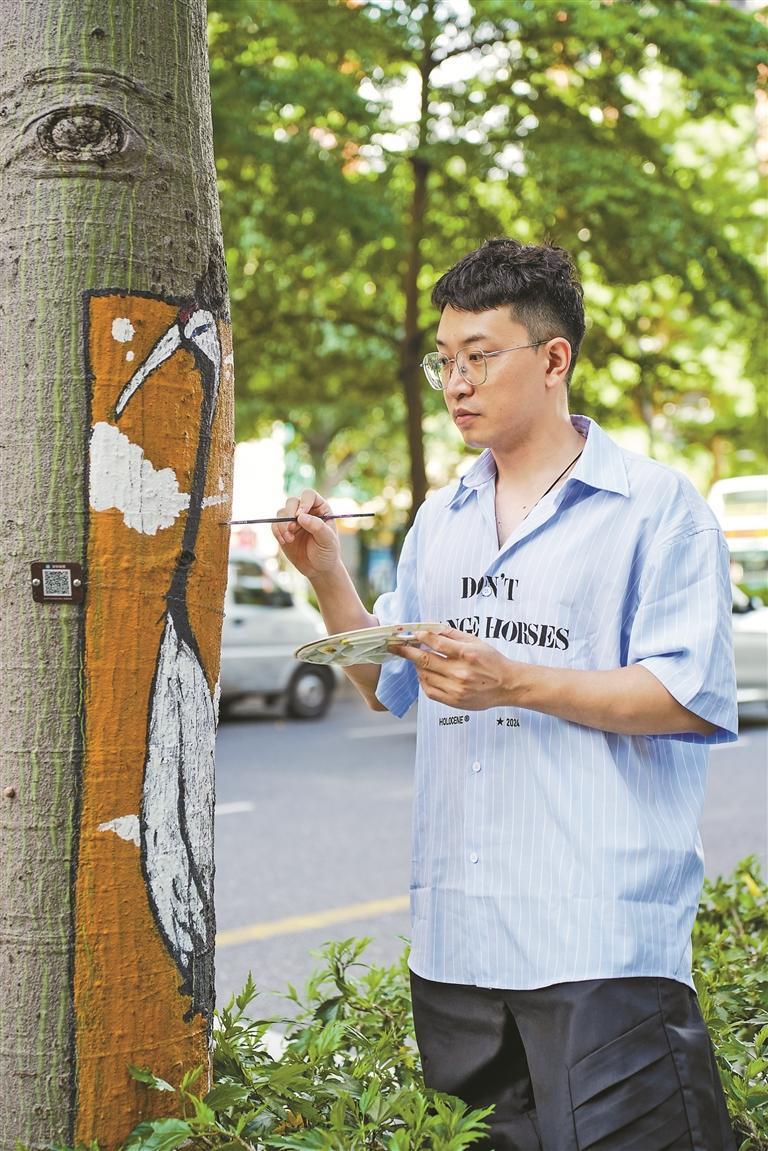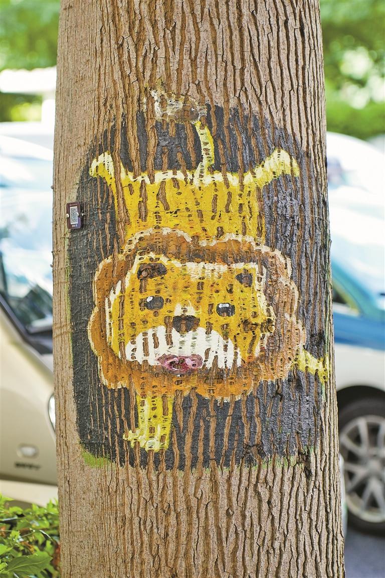 在選擇作畫(huà)樹(shù)木時(shí),樹(shù)繪師也格外用心。李斯瑋說(shuō)他會(huì)觀察樹(shù)木位置是否顯眼,形態(tài)是否適合創(chuàng)作,作品能否融入周邊環(huán)境,并盡力對(duì)樹(shù)干上的樹(shù)疤、樹(shù)瘤、創(chuàng)傷進(jìn)行美化。此外,他使用的涂丙烯顏料可起到一定的遮蓋、防護(hù)作用,不僅不會(huì)對(duì)樹(shù)木造成傷害,還能起到防蟲(chóng)的效果。(記者 郭海南 實(shí)習(xí)生 周佳琪 彭曉雅)