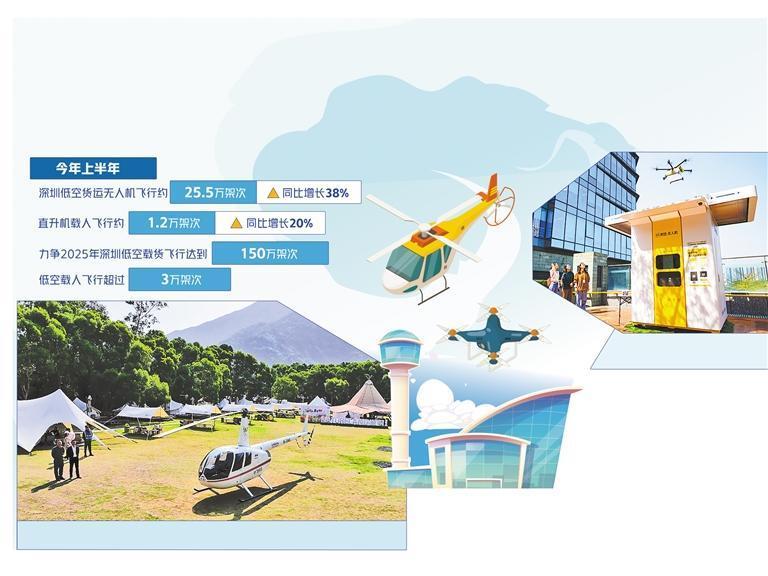 當(dāng)前,深圳低空應(yīng)用場景已覆蓋空中通勤、低空觀光、物流配送、城市治理、應(yīng)急救援等各個領(lǐng)域,僅在物流配送方面,便涉及快遞配送、餐飲配送、醫(yī)療運輸、生鮮冷鏈等。今年上半年,深圳低空載貨無人機飛行量、新增貨運航線、載人飛行量、運送人數(shù)規(guī)模均居全國前列。其中,低空貨運無人機飛行約25.5萬架次,同比增長38%;直升機載人飛行約1.2萬架次,同比增長20%。目前,深圳正進一步拓展應(yīng)用服務(wù),力爭2025年低空載貨飛行達到150萬架次,低空載人飛行超過3萬架次。