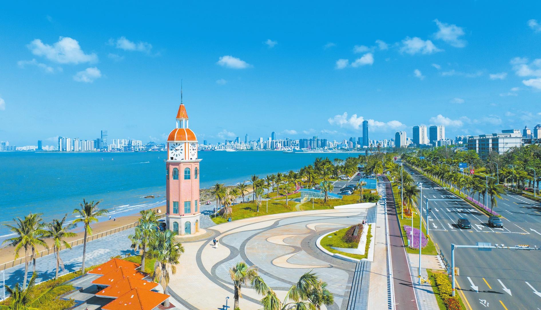 圖為10月20日,遠眺濱海大道,水天相接,岸邊的沙灘、鐘樓、椰林融為一體,相映成趣,椰城??诘臑I海美景一覽無遺。記者 楊忠凱 攝