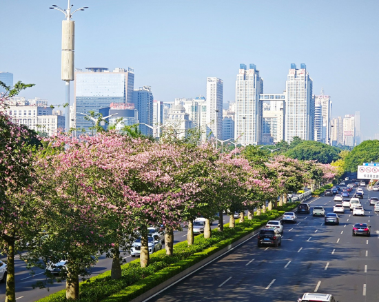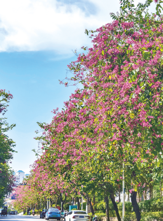 秋風(fēng)拂過,城市各條道路、橋梁兩旁,綠樹和各色花朵相互映襯,演繹著專屬綠城的秋日浪漫。綠城南寧,“綠”是不變的底色。民族大道兩旁,異木棉花開一路,在綠樹映襯下分外美麗。古城路綠樹成蔭,機(jī)動(dòng)車、行人穿行其間,陽光從樹葉間灑下。百花嶺路兩旁的羊蹄甲花競相開放,讓道路變成了花廊。邕城秋色中,又怎能少得了三角梅?良慶大橋上的三角梅熱情綻放,與從江上駛過的船只構(gòu)成了一幅寫意的畫卷……(記者 覃雨軒)
