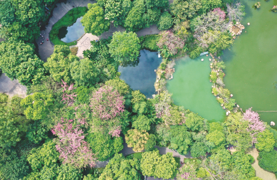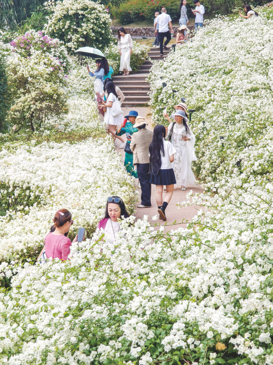 民族廣場上,孩子們?cè)谇锶张栂卤寂?、與鴿子嬉戲;五象湖公園內(nèi),時(shí)??梢娛忻襁\(yùn)動(dòng)的身影,處處充滿無限的生機(jī)與活力;獅山公園里,落羽杉換上金黃色的“新衣”,仿佛秋天的使者,向人們傳遞季節(jié)的更迭;南湖公園里,蒜香藤形成紫色“瀑布”,讓人仿佛進(jìn)入一個(gè)紫色的夢幻世界;青秀山風(fēng)景區(qū)層林盡染,人們?cè)谌~子花園里拍照打卡,在金杉湖邊漫步……