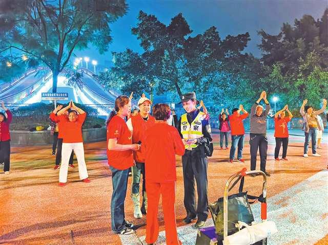 重慶市綦江區(qū)社區(qū)民警帶領網(wǎng)格員勸導“壩壩舞”隊伍控時降噪。