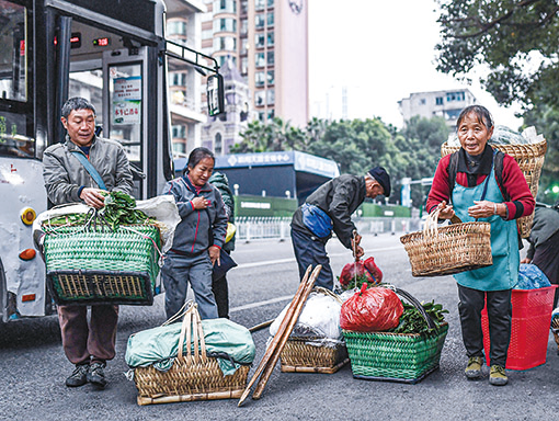 菜農(nóng)在貴陽市大營坡終點(diǎn)站下車,準(zhǔn)備將蔬菜就近售賣(11月7日攝)。